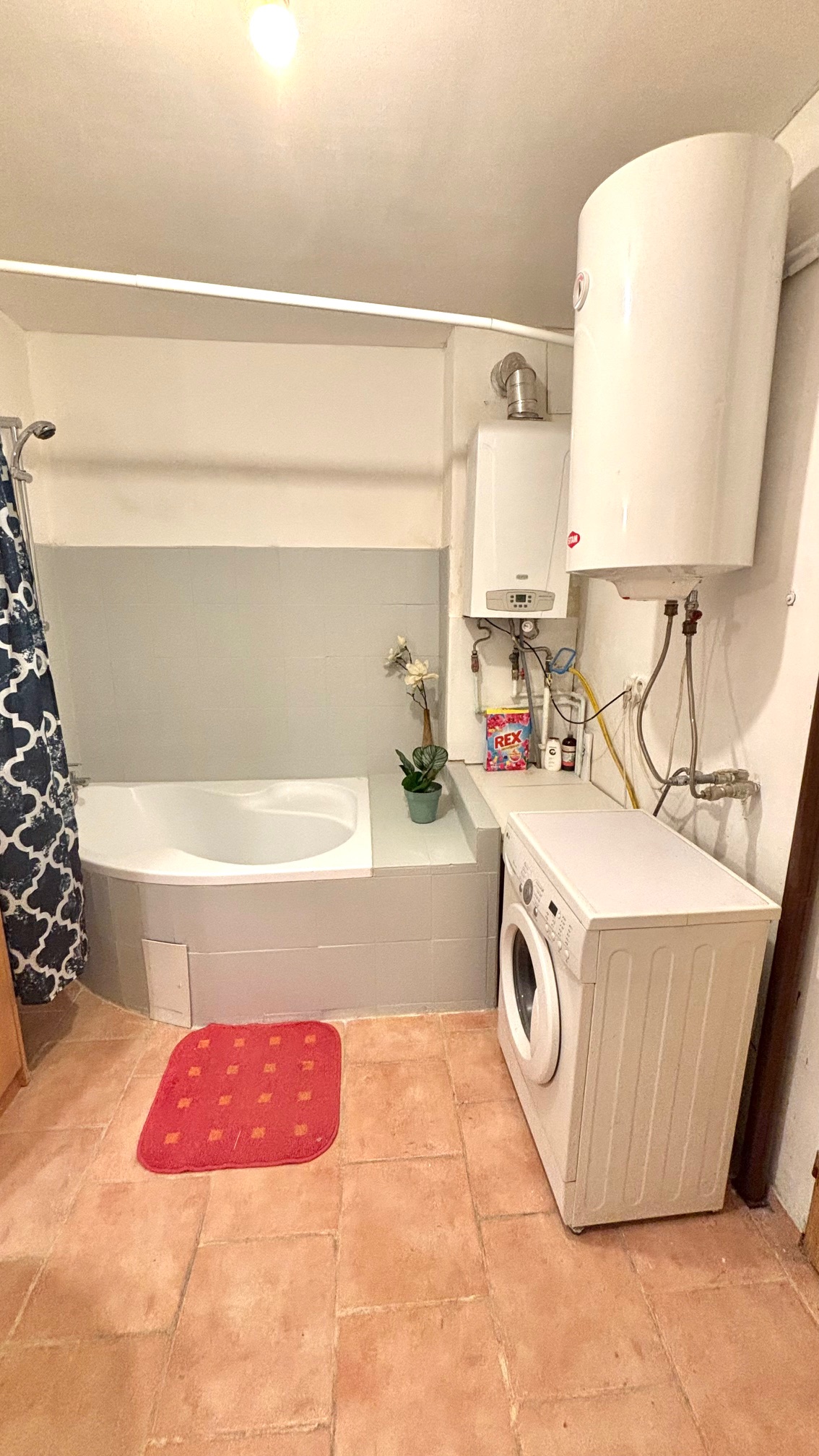 Vytápění zajištuje plynový kotel, ohřev vody el. bojlerem.