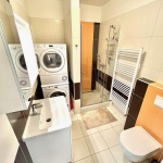 Koupelna se sprchovým koutem a WC s pračkou a sušičkou.