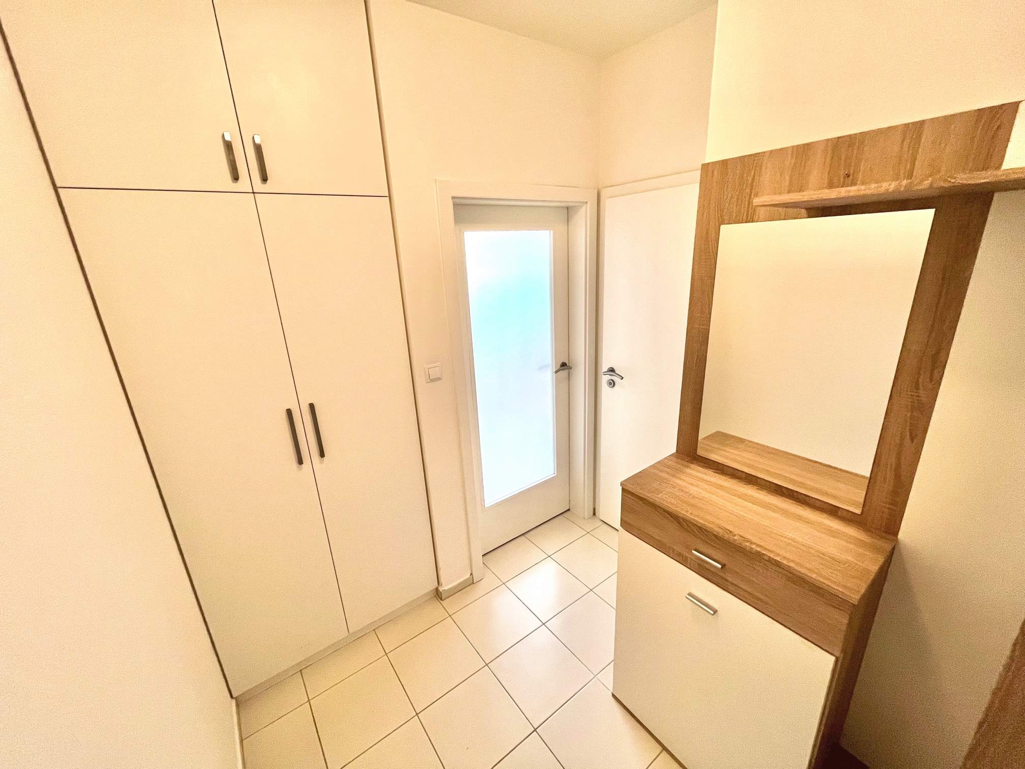 V předsíni vestavěná šatní skříň, věšáková stěna se skříňkou na obuv.