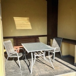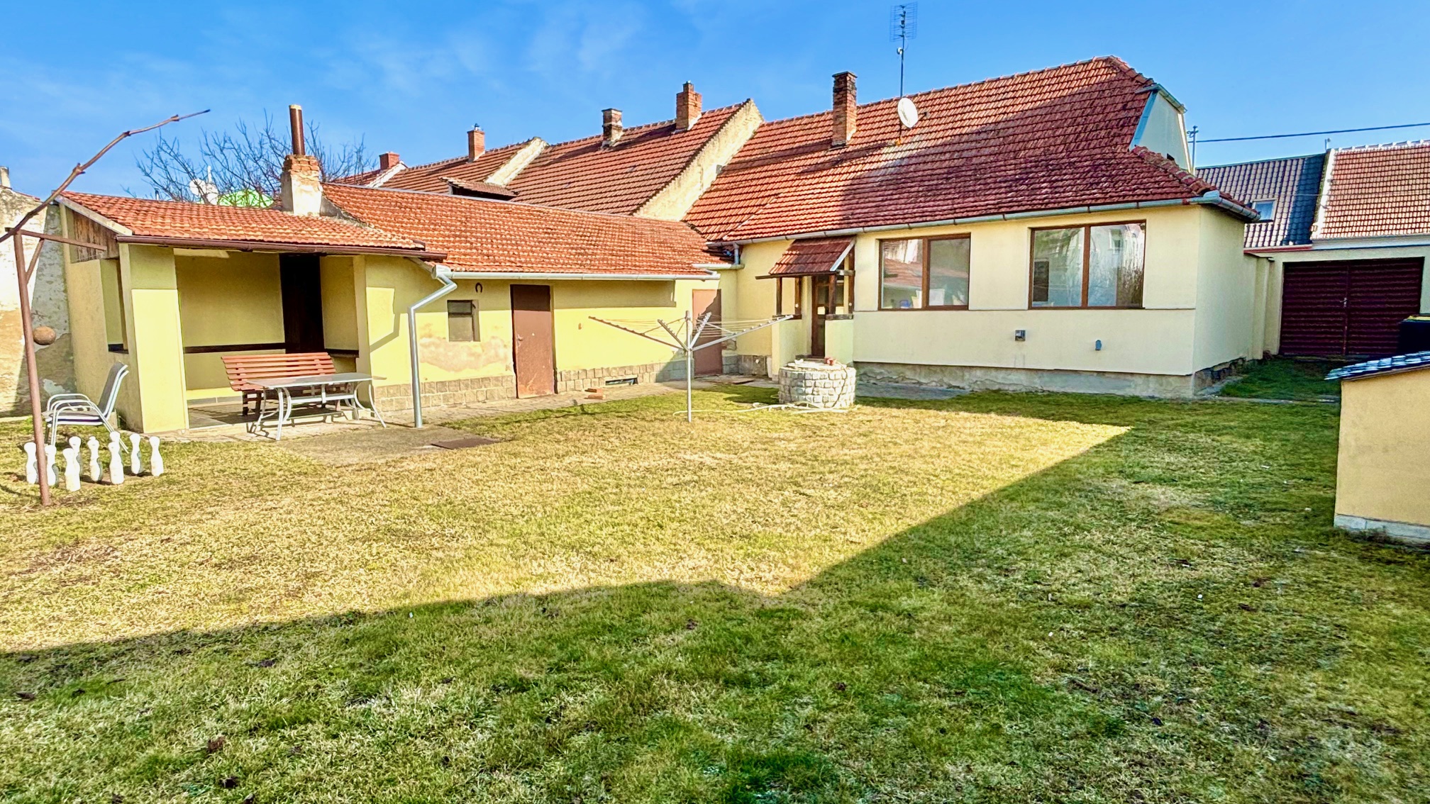 Ze dvora je přístupná krytá terasa s posezením 8,3m2, dílna 16m2 (k dispozici sekačka, vertikutátor...) a další prostor 4,5m2).